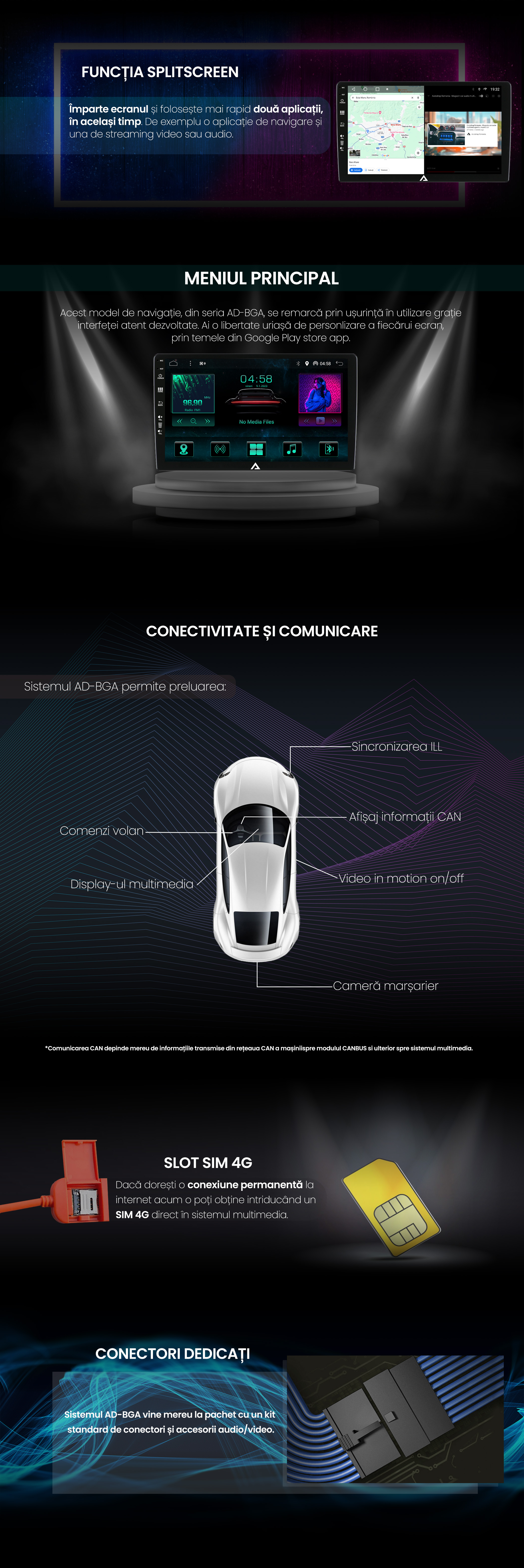 Seria AD-BGA include Slot SIM 4G dedicat, oferind acces direct la internet fără a depinde de hotspot-ul telefonului. Pe lângă aceasta, sistemul suportă WiFi, Bluetooth, dongle 3G–4G și router extern.