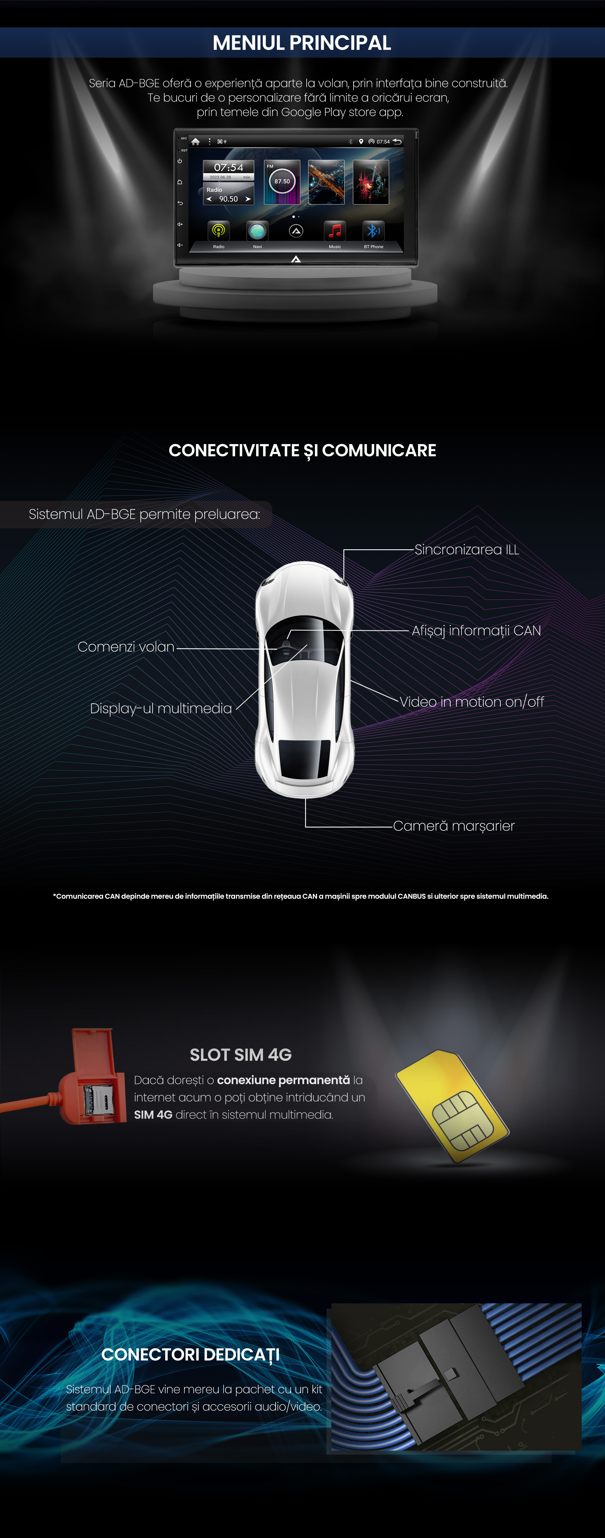 *Unele autoturisme pot necesita adaptări speciale, de exemplu un alt tip de chenar de încadrare sau conector alimentare. Aceste aspecte se discuta înainte de achiziție dacă este cazul și se pot remedia pe parcurs împreună cu suportul tehnic. Firma noastră își rezervă dreptul de a nu onora o comandă dacă consideră că un produs nu este cel puțin 95% compatibil și conform cu autoturismul în caz, indiferent de decizia clientului.
